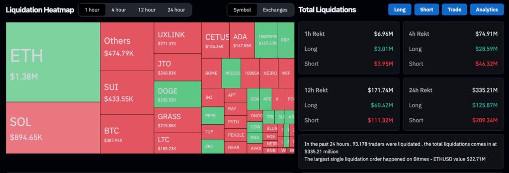 比特币震盪拉涨的行情中,据 Coinglass 数据 显示,过去 24 小时,加密货币全网爆仓金额超过 3.35 亿美元(空头占 2.09 亿美元),有超 9.3 万人遭清算。