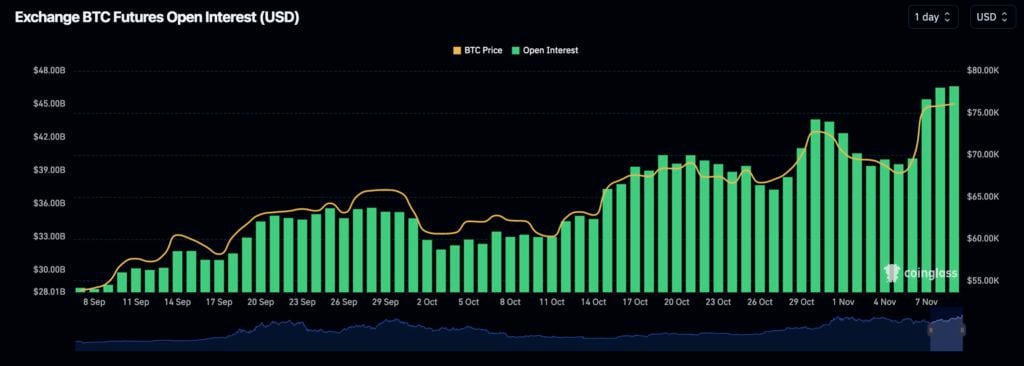 另一方面,目前比特币在交易所的未平仓金额来到 466 亿美元再度刷新历史新高纪录,通常这预示著会有更大的波动或是短期高点已至,请投资者小心谨慎。