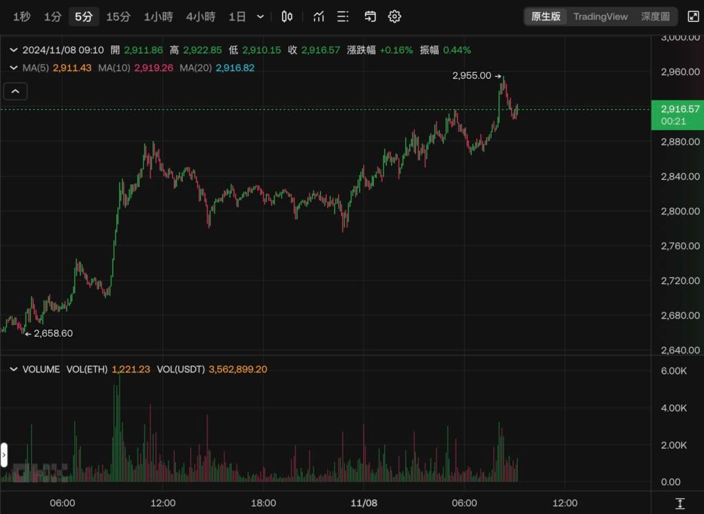 以太坊则是展现出较比特币更强劲的涨幅,截稿前最高来到 2,955 美元、现报 2,916 美元,近 24 小时上涨幅度达到 4.78 %。