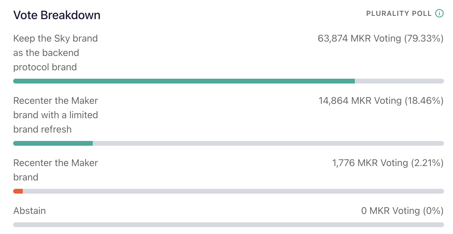 如今,这一提案的投票结果出炉,社群成员决定维持品牌重塑为 Sky。根据 MakerDAO 治理论坛的数据,在三个选项中,即「保留 Sky 品牌作为协议核心」、「以有限更新重新定义 Maker 品牌」和「恢复 Maker 品牌」,选择保留 Sky 品牌作为协议核心的选项获得了近 80% 的票数,显示出压倒性的支持。
