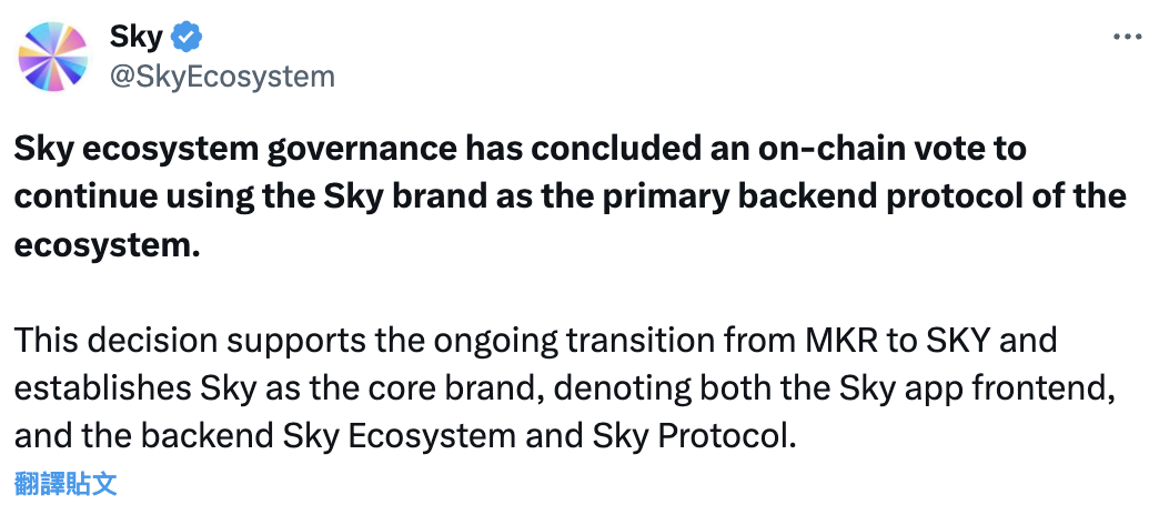 官方发推 表示 ,这一决定支持从 MKR 到 SKY 的平稳过渡,并正式确立 Sky 作为核心品牌,涵盖了 Sky 应用的前端界面和后端的 Sky 生态系统及协议。