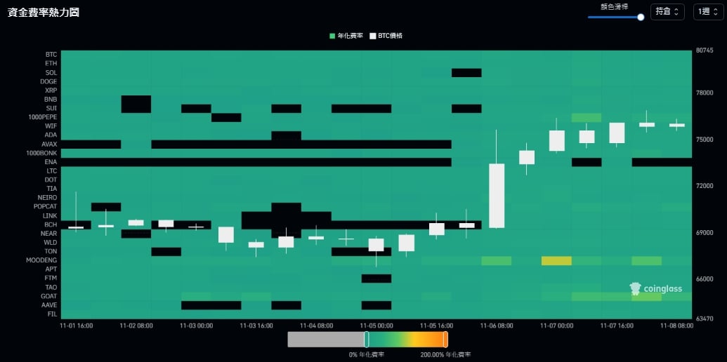资金费率热力图 展示 了不同加密货币的资金费率变化趋势,颜色从零费率的绿色到 50% 正费率的黄色,黑色则代表负费率;白色 K 缐图则显示比特币价格波动,与资金费率形成对比。