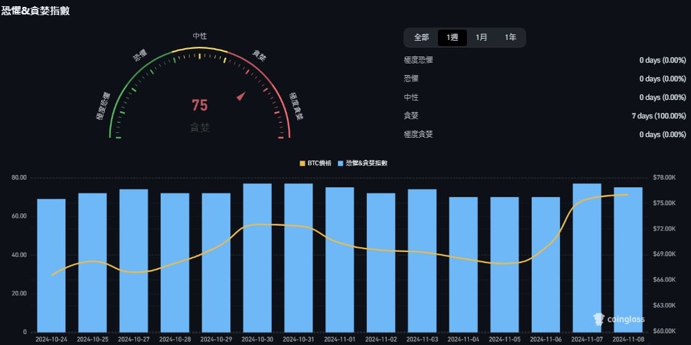 本周的市场情绪 指标 由 74 (贪婪)上升至 75 (贪婪),整周在(贪婪)的区间。