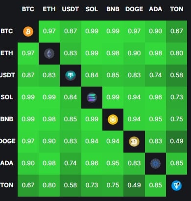 本周数据 显示 ,BTC 与 ETH 和 SOL 的相关性分别达到 0.97 和 0.99,主要代币之间的相关性普遍增强,显示市场对整体趋势的共识进一步提高。主要代币的相关係数多数稳定在 0.90 左右,反映出市场风险偏好的一致性。然而,TON 与其他主流加密货币的相关性依然偏低,显示其价格波动较为独立,为投资组合提供了分散风险的可能性。