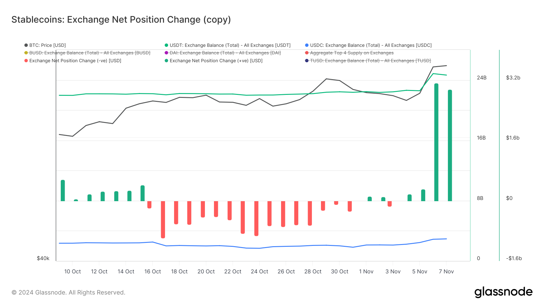 数据 显示 ,本周交易所整体资产呈现净流入,尤其在美国大选后,USDT 出现大量流入。这表明投资者可能正在为进一步的市场活动做準备,资金进入交易所或预示著短期内的潜在购𧹒需求增强。