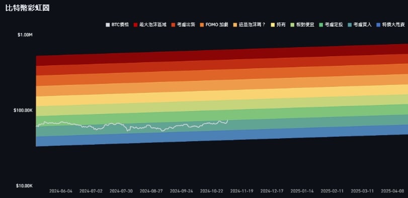 比特币彩虹图 展示 ,比特币当前价格( 7.5 万美元 )位于「 考虑𧹒入 」至「 考虑定投 」区间。