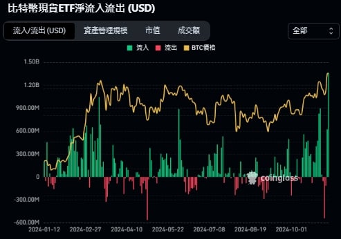 本周比特币 ETF 资金 流入 12.691亿美元,11 月 7 日 创单日进流入纪录达 13.6 亿美元。