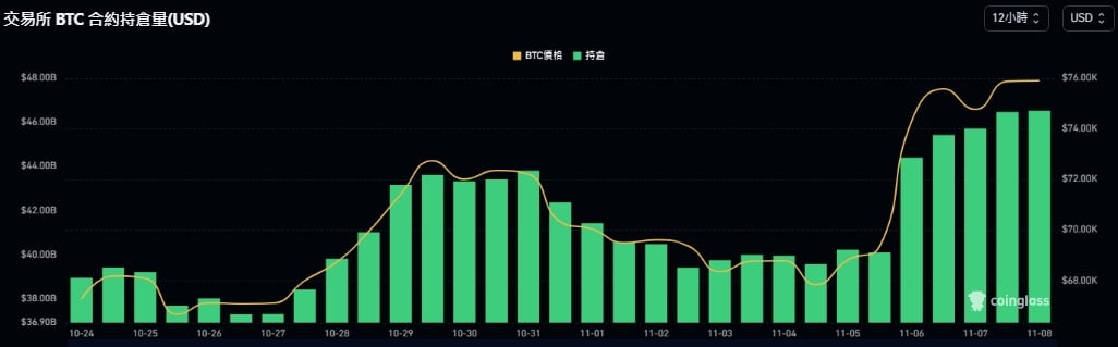 根据 数据 ,本周比特币在交易所内的合约持仓量呈现稳定上升趋势,从 405.5 亿美元 一度升至 465.3 亿美元 ,在比特币合约持仓量创新高同时比特币价格也创新高。
