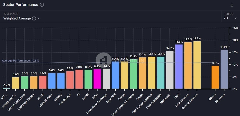 根据 Artemis 数据 显示 ,本周区块链领域板块的平均涨幅为 (10.8 %) ,其中 质押服务、数据服务、DeFi 分别以 (19.7%、19.2%、18.3%) 占据前三。