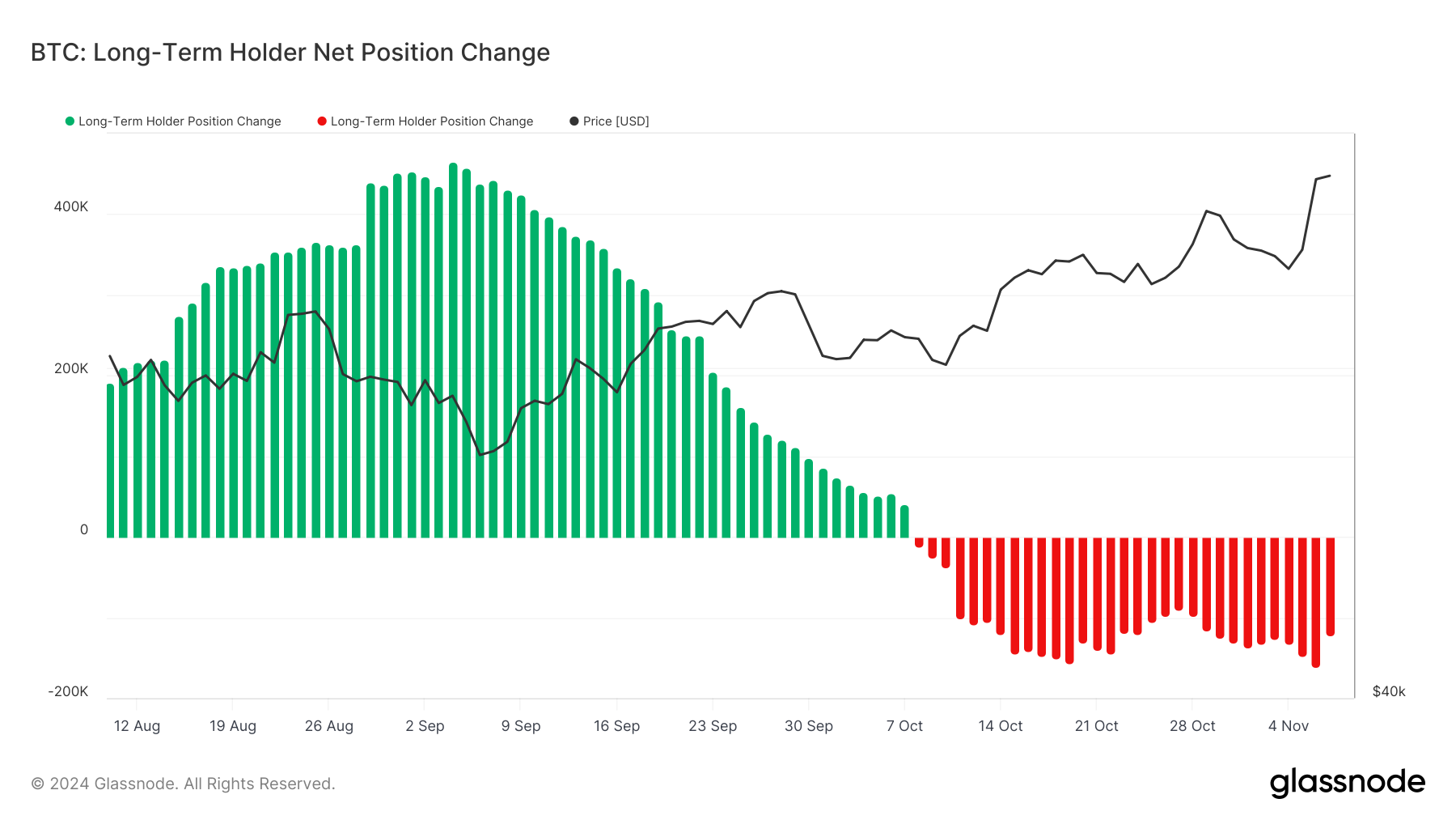 根据链上 数据 ,比特币长期持有者的净头寸变化延续了上周的下降趋势,自 10 月中旬起持续转为负值。随著 BTC 价格突破 7 万美元,长期持有者的减仓行为显著加速,并呈现出稳定的净流出模式,显示部分长期持有者选择在高位获利了结。