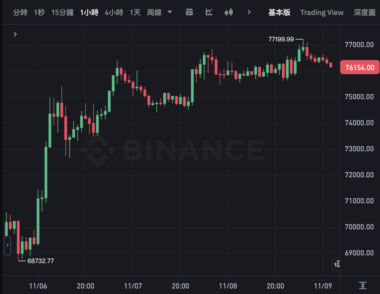 - 今日凌晨 3 点半突破 7.7 万美元,最高达 77,200 美元,创下历史新高