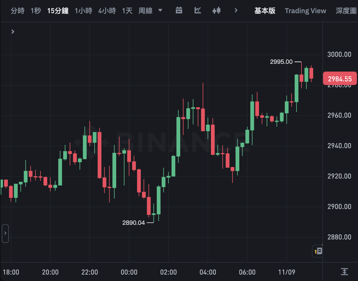 以太坊涨势更为凶猛,于今晨约 9 点攀升至 2,995 美元,创下 3 个多月以来新高。截稿前现报 2,984.55 美元,近 24 小时上涨近 2%。