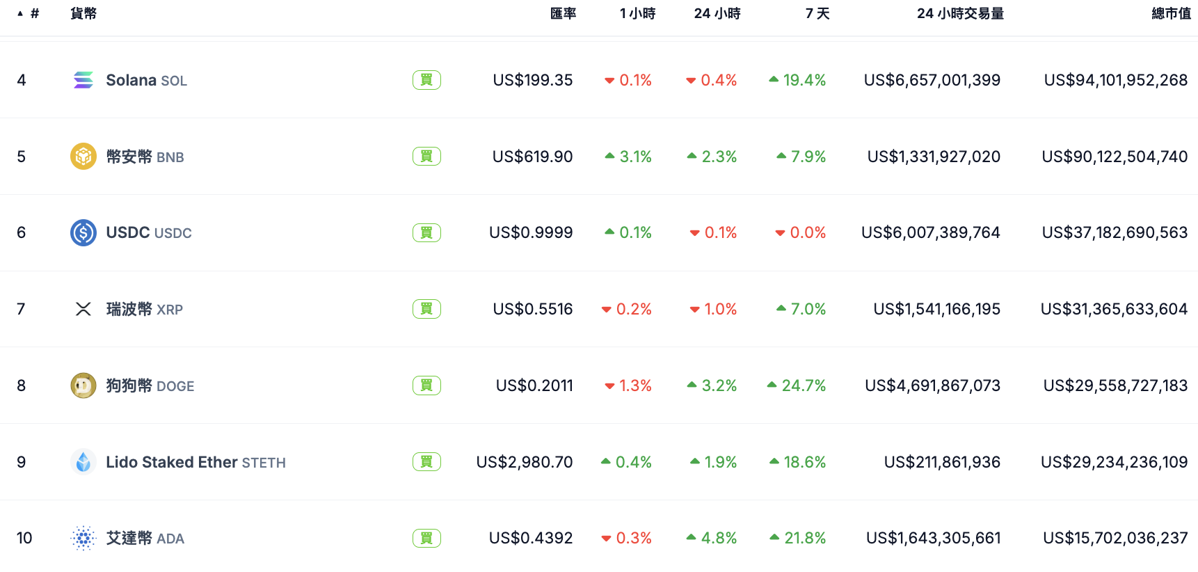 其他市值前十大币种也呈现普涨,其中涨幅最大的是 ADA,近 24 小时上涨 4.8%。