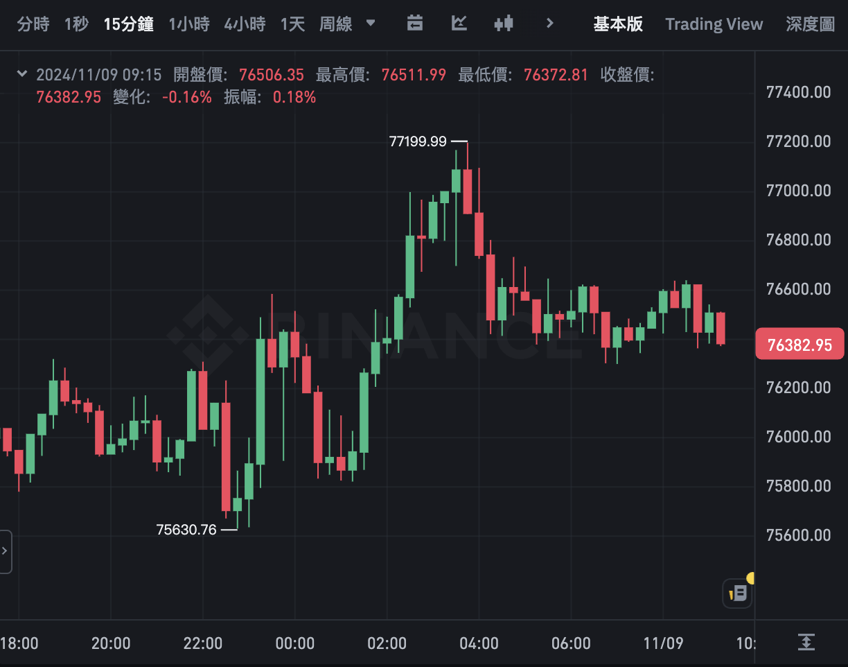 截稿前略有回落降至 76,383 美元,近 24 小时上涨幅度缩小到 0.31 %。