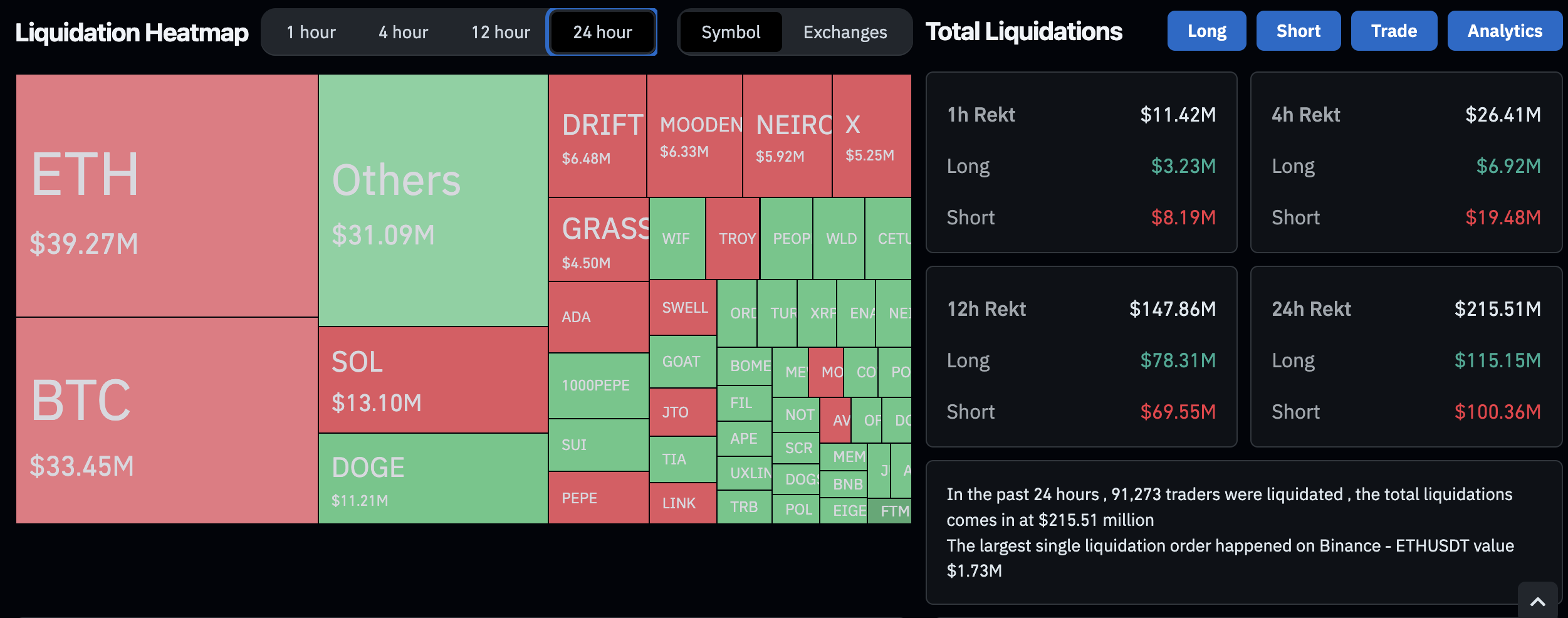 比特币震盪上涨的走势下,据 Coinglass 数据 显示,过去 24 小时,加密货币全网爆仓金额超过 2.15 亿美元,多空清算金额大略均等,有超 9.1 万人遭清算。