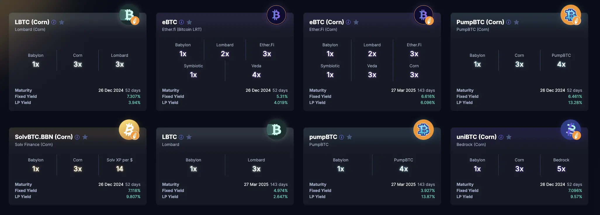 积分衍生市场是 BTC LST 作为生息资产的关键策略场景之一。作为该板块的龙头协议,Pendle 在 9 月初开始率先开始了对各家 BTC LST 的集成。目前,Corn、Pendle 和 BTC LST 的合作支持了五大 BTC LST 资产:LBTC ($ 41.5 M TVL, $ 1.1 M 24 h Volume)、SolvBTC.BBN ($ 97.5 M TVL, $ 300 K 24 h Volume)、eBTC ($ 20.2 M TVL, $ 658.4 K 24 h Volume)、PumpBTC ($ 60.5 M TVL, $ 437 K 24 h Volume)、uniBTC ($ 70.6 M TVL, $ 20.8 K 24 h Volume),吸纳了 BTC LST 市场总量的 11.4% ,多方合作产生了良好的联动效应: