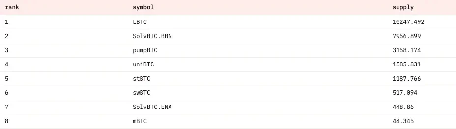 从 BTC 锚定资产在以太坊、Arbitrum、BNB 三大网络的发行情况可以看出,中心化托管发行的封装 BTC 仍然占据绝大多数市场份额,其中 $WBTC ( 156.1 K supply) 和 $BTCB ( 65.3 K supply) 合计占据了整体 BTC 锚定资产流通量的 75% 以上。此外 $LBTC ( 10.5 K supply) 和 $SolvBTC.BBN ( 8 K supply) 等 BTC LST 近几个月在 BTC (re)staking 叙事的推动下增长迅速,成为 BTC 锚定资产市场的另一股新兴力量。