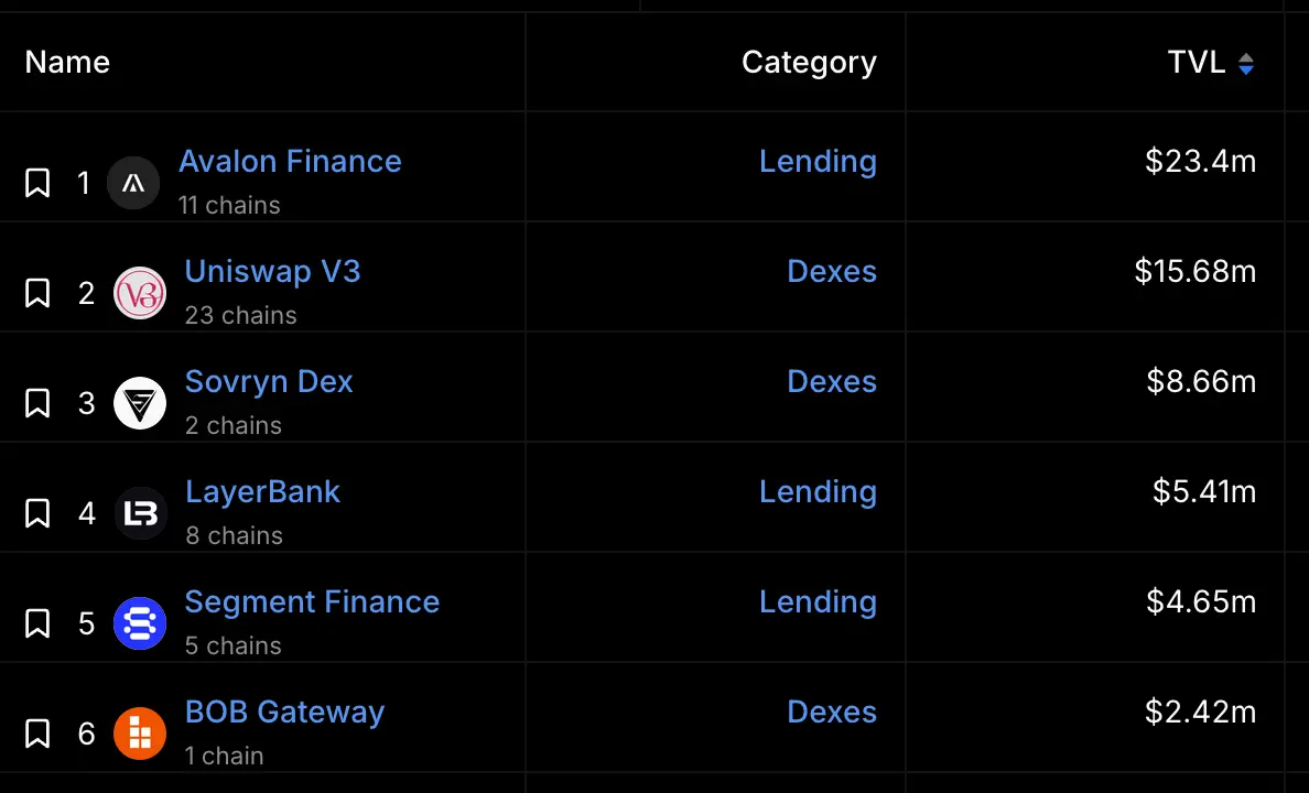 在生态建设上,BOB Stake 集成了以 Babylon 质押为核心的多种质押协议,支持的流动质押代币 LST 包括 SolvBTC.BBN、uniBTC、PumpBTC。BOB 还成为多个聚合器和钱包的首选 BTC 质押平台,在 Staking Rewards 平台上吸引了超过 300 万用户。此外,BOB 还与 Avalon、Layerbank 和 Segment 等数十个 DeFi 协议进行了集成,为 BTC LST 提供了多样化的生息应用场景,同时不断加强市场影响力。目前,Avalon 作为 BOB 生态内的主要借贷协议,吸引了链上 35.6% 的资产沉淀,几乎全部由 SolvBTC.BBN 的 supply 构成。然而使用率仅为 8.9% ,说明 BOB 生态的实际借入需求偏低,流动性聚合和生态协议有待加强。