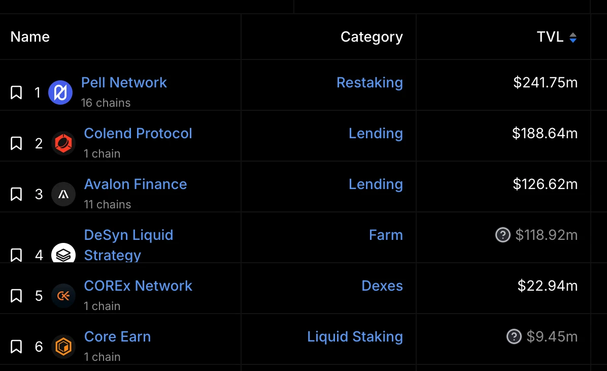 如今,Core 的 TVL 已达到 $ 591.5 M,半年增长 4757.9% ,跻身成为 TVL 排名第 16 位的区块链。Core TVL 的增长呈现出几个关键的节点: 6 月,原生借贷协议 @colend_xyz 的推出以及与 @SolvProtocol 衍生资产的集成,推动了当月 $ 51.1 M 的 TVL 增长,增幅达 202.2% 。7 月,双重质押机制的引入带动了新的资金流入,推动了当月 $ 92.6 M 的 TVL 增长,增幅达 121.3% 。8 月,BTC Restaking 龙头协议 @Pell_Network 在 Core 的集成进一步引发更大规模的资金沉淀。
