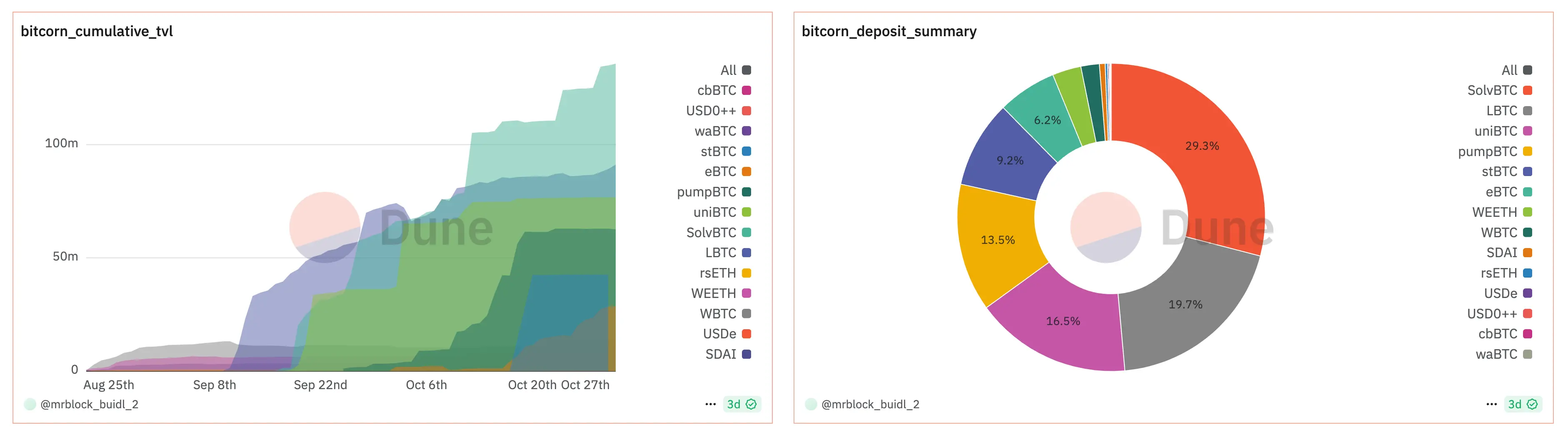 目前 Corn 尚未启动主网,但已通过联合多方推出的存款活动有效吸纳了 $ 425.8 M 的资金存储,显著超过了 Merlin 和 BSquared 等已经上线的 BTC 扩展层。这些存款主要集中在与 LBTC、SolvBTC.BBN、eBTC、PumpBTC、uniBTC 几家 BTC LST 共同在 Pendle 推出的池子中,占当前总 TVL 的 85% 。
