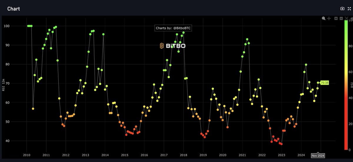 目前 RSI 为 70.38,与过往牛市的数据相比, BTC 似乎还没有达到峰值。