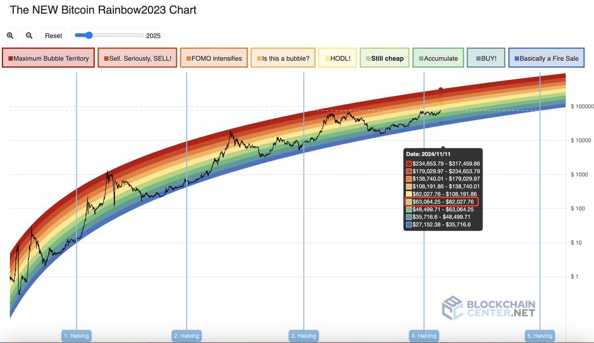 彩虹图是一种长期估值工具,使用对数成长曲缐来预测 BTC 的潜在未来价格方向。 新的比特币 Rainbow2023 图表显示 BTC 仍然很便宜。