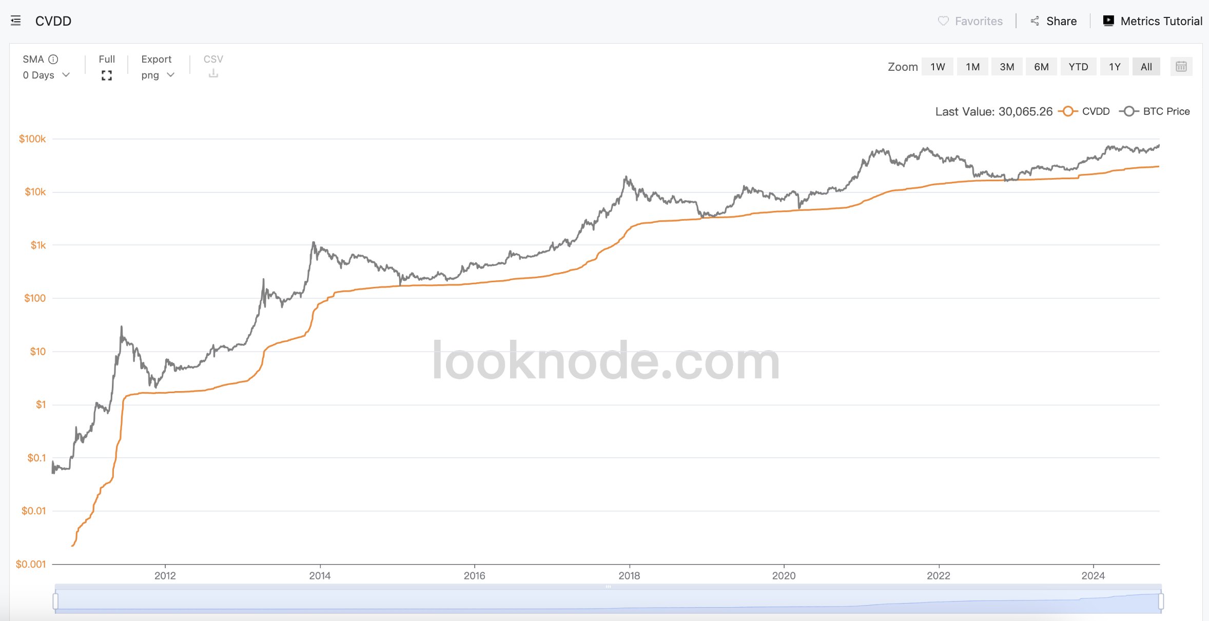 目前的 CVDD 显示 BTC 的顶部似乎尚未到达。