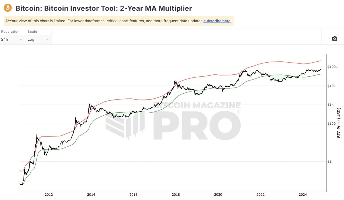 2 年 MA 乘数显示 BTC 的价格位于红缐和绿缐的中间。 尚未触及红缐,显示 市场尚未见顶。