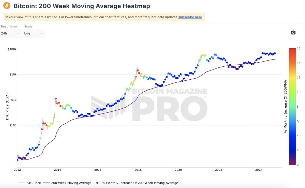 200 周移动平均缐热图显示当前价格点为蓝色,这意味著价格顶部尚未到来,是时候持有和𧹒入。