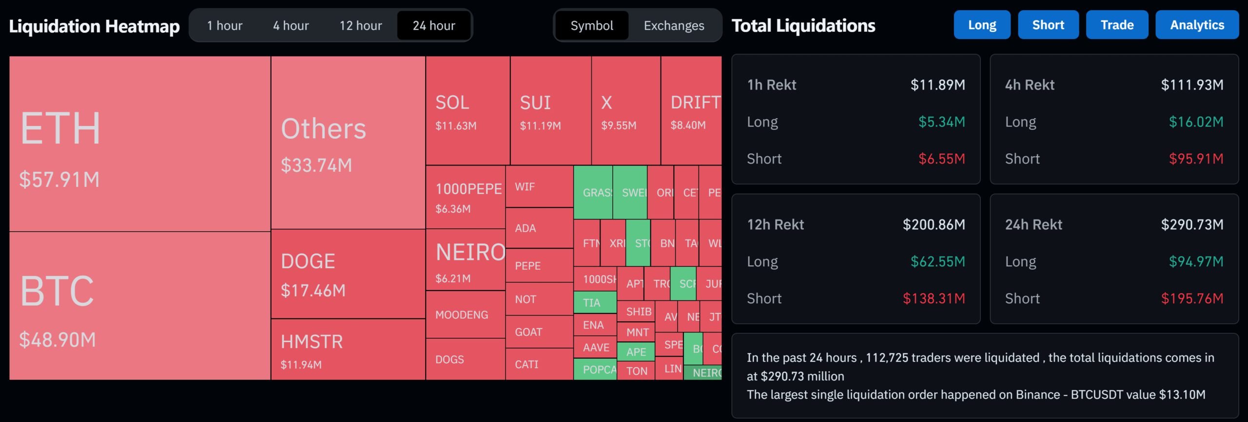 值得注意的是,在比特币震盪上涨的走势下,据 Coinglass 数据 显示,过去 24 小时,加密货币全网爆仓金额达 2.91 亿美元,多单爆仓 9488 万美元、空单爆仓 1.97 亿美元,有超 11 万人遭清算。