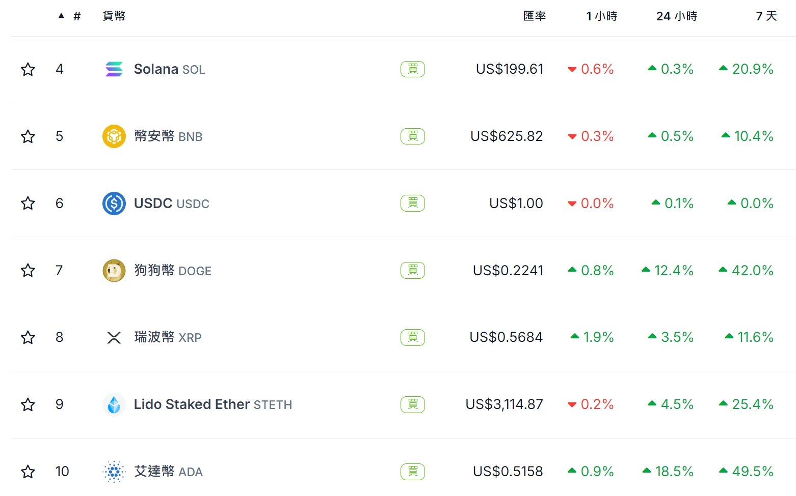 CoinGecko 数据 显示,其他市值前十大币种呈现普涨,涨幅最大的是 DOGE、ADA,分别大涨 12.4% 至 0.2241 美元、大涨 18.5% 至 0.5158 美元,另外,SOL 上涨 0.3% 至 199.61 美元,BNB 上涨 0.5% 至 625.82 美元,XRP 上涨 3.5% 至 0.5684 美元。