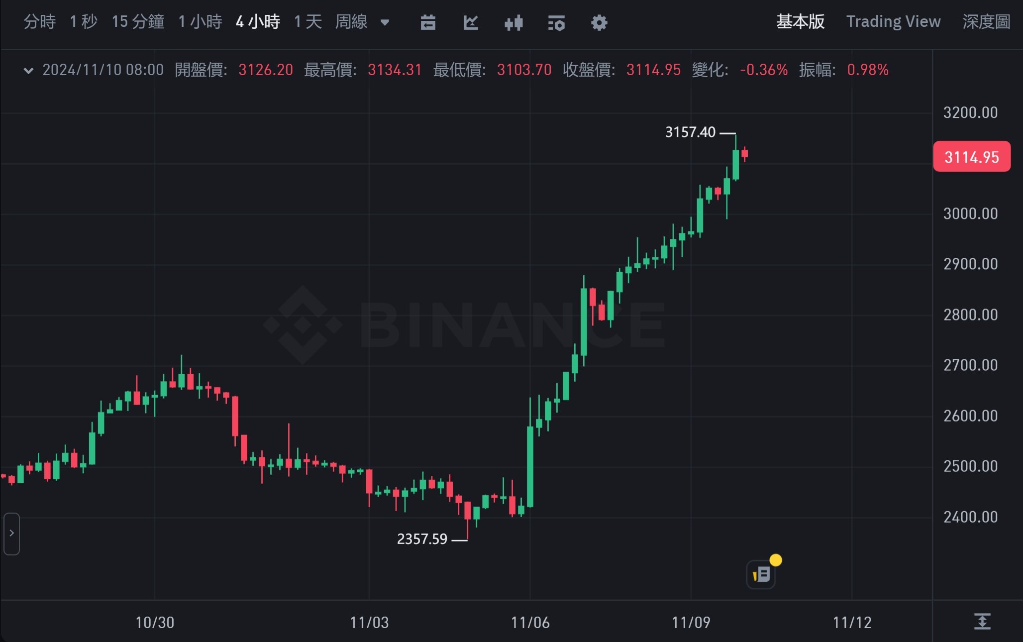 以太坊方面则表现强势,自 6 日以来不断上扬,在昨日突破 3000 美元后,于今早 7 时攀升至 3157 美元高点,创下 8 月 1 日来新高,现报 3114 美元,近 24 小时上涨 4.4%。