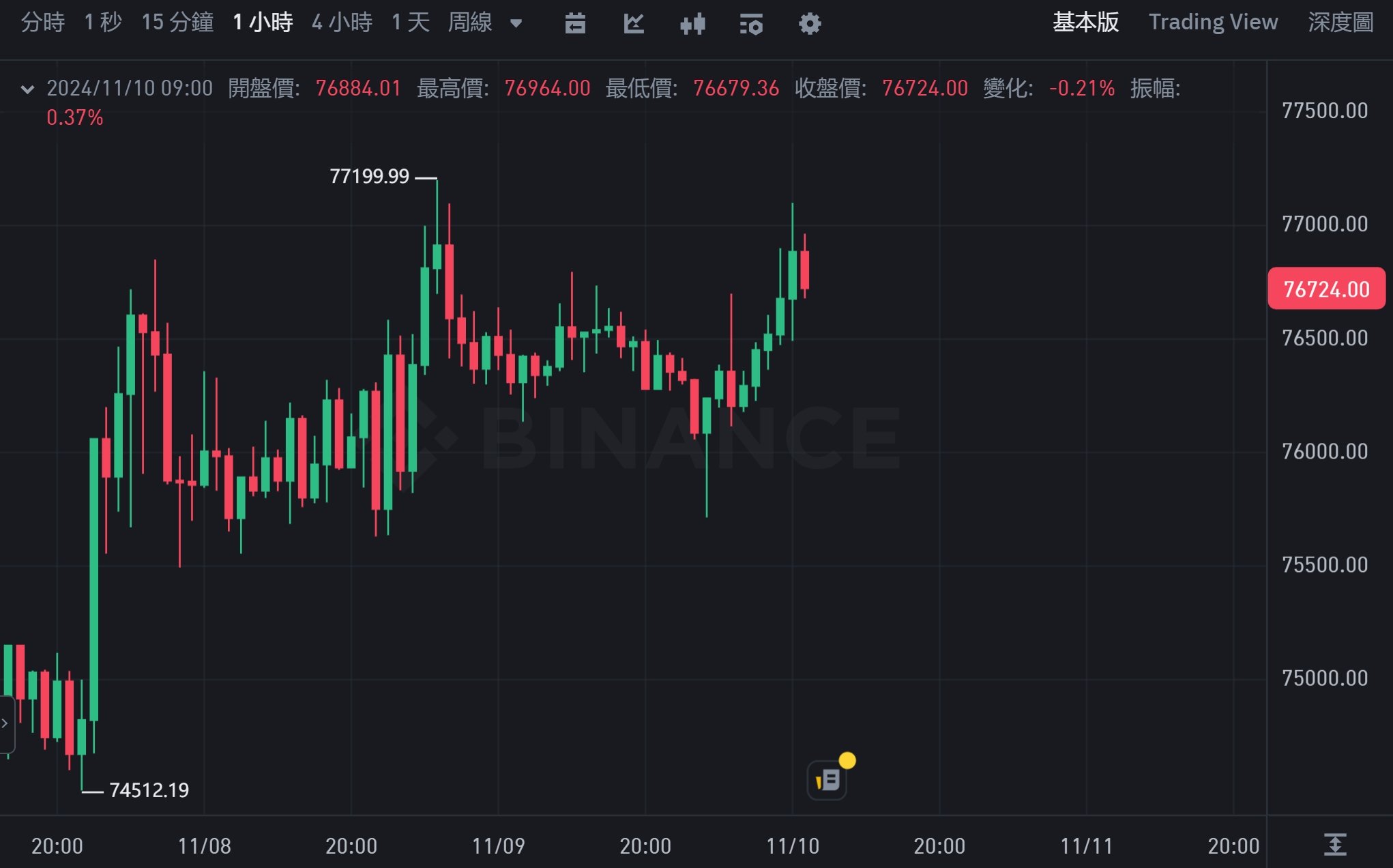 在 川普胜选后,比特币连日来持续上涨,在昨晨 3 时首度 突破 7.7 万美元,高点达 77,200 美元,此后𫔭始下杀,在今晨 1 时最低跌至 75714 美元,随后止跌回升,在今早 8 时短暂冲上 77100 美元后再度回落,现报 76724 美元,近 24 小时涨幅 0.4%。