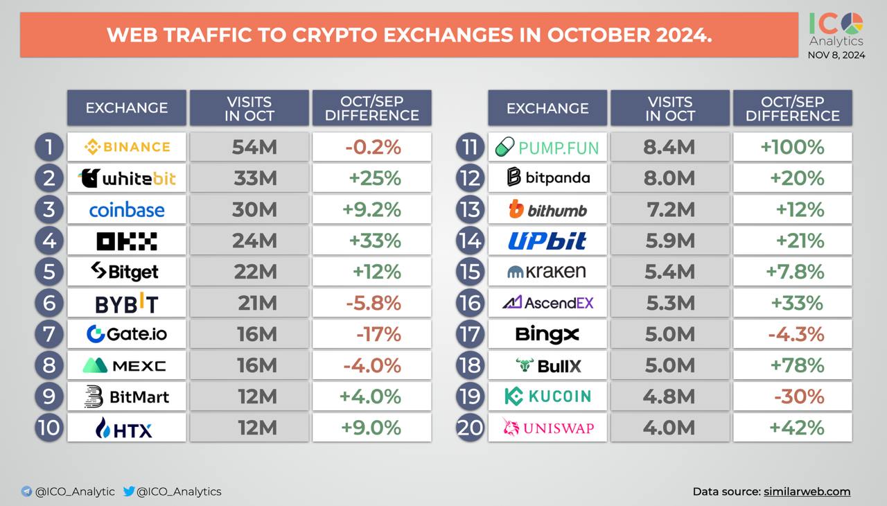 据 ICO Analytics 数据 显示,今年10 月,20 家主要加密货币交易所的累计月浏览量成长 8%,Pump.Fun 的月增幅最高,10 月成长达 100%,BullX 紧随其后,月流量增长 78%,Uniswap 则以 42% 增幅位居第三。