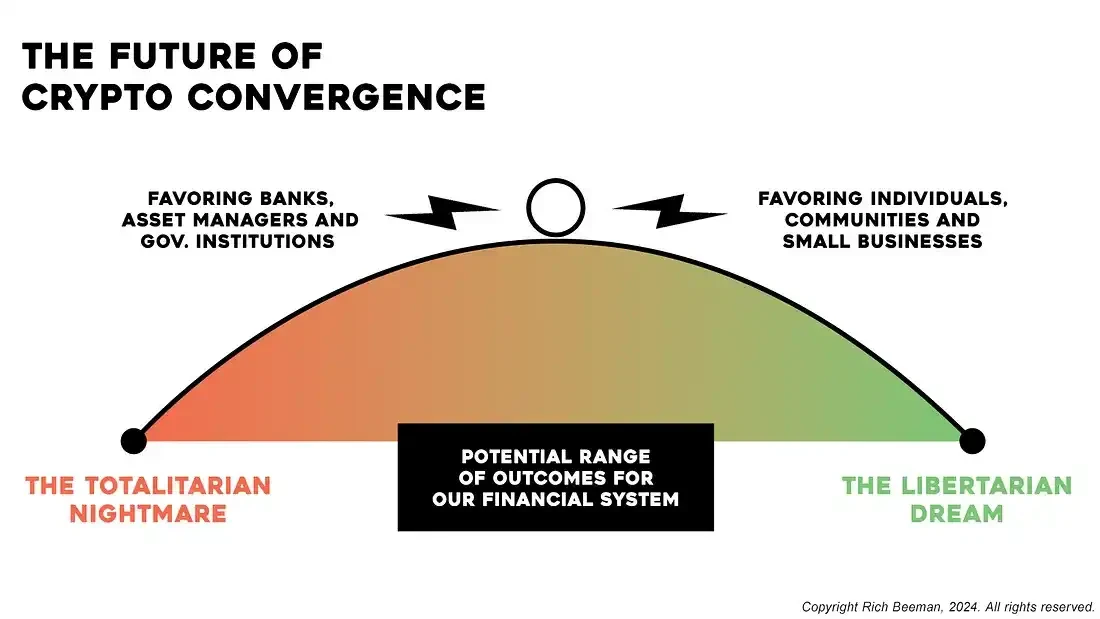 加密货币融合的未来无法预测,但我们可以假设它位于某个光谱的某个位置。在一端是极权噩梦,这是一个加密技术被政府和金融机构挟持以扩展中央集权控制的世界。