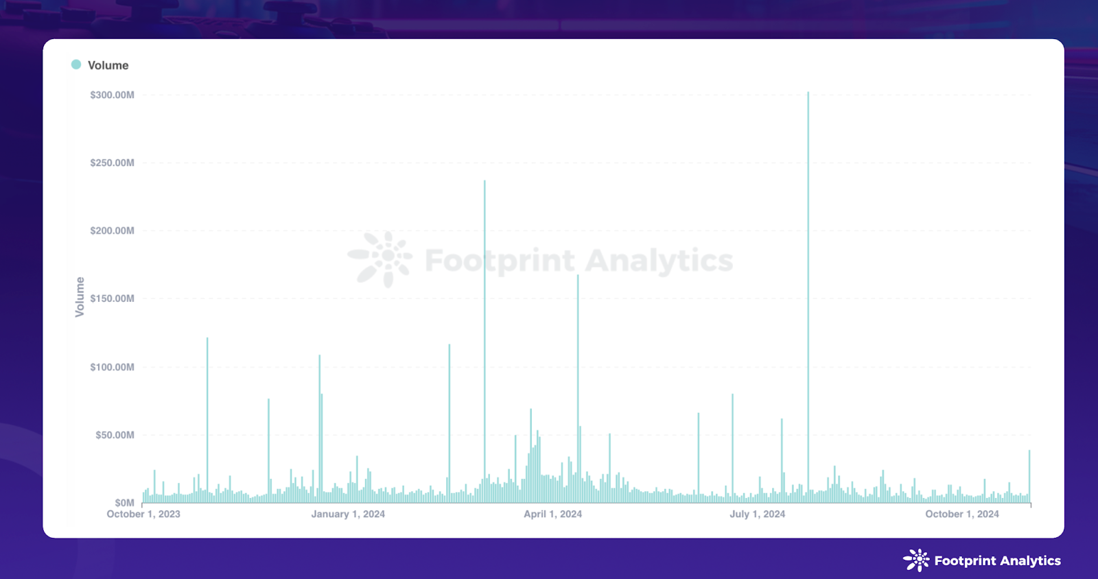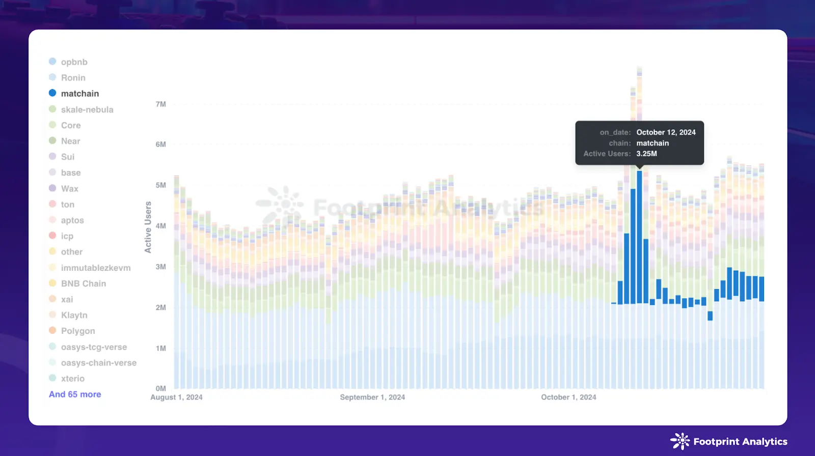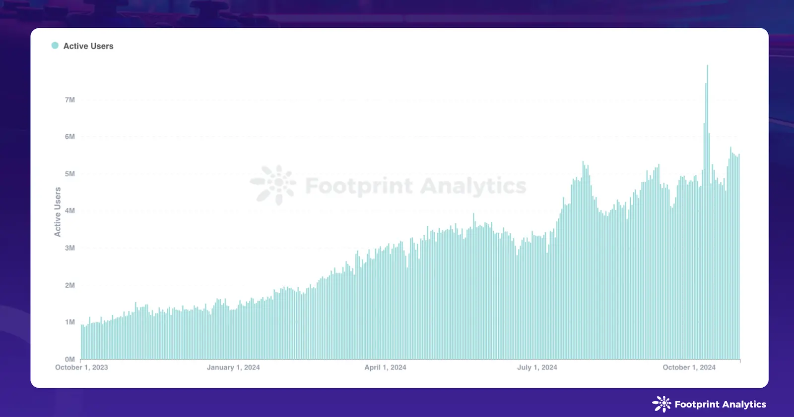 用户参与指标表现出更大的变化,10 月日活跃用户(DAU)达到新高,达 530 万,较 9 月增长11.3%。这一增长主要受到 Matchain 在 10 月 10 日至 13 日期间的用户指标峰值影响,其在 Telegram 生态系统中上线了四款游戏。Telegram 游戏相关活动的激增继续重塑用户获取模式。