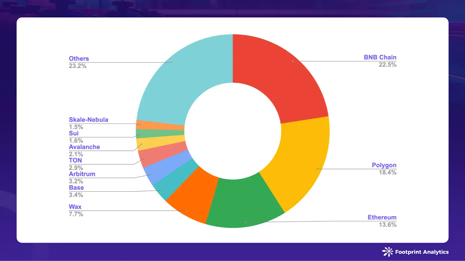 10 月活跃区块链游戏数达到 1,606 款,较 9 月略增长 1.6%。 BNB 链 , Polygon 和 Ethereum 分别以 22.5%、18.4% 和 13.6% 的市场份额位居前列。