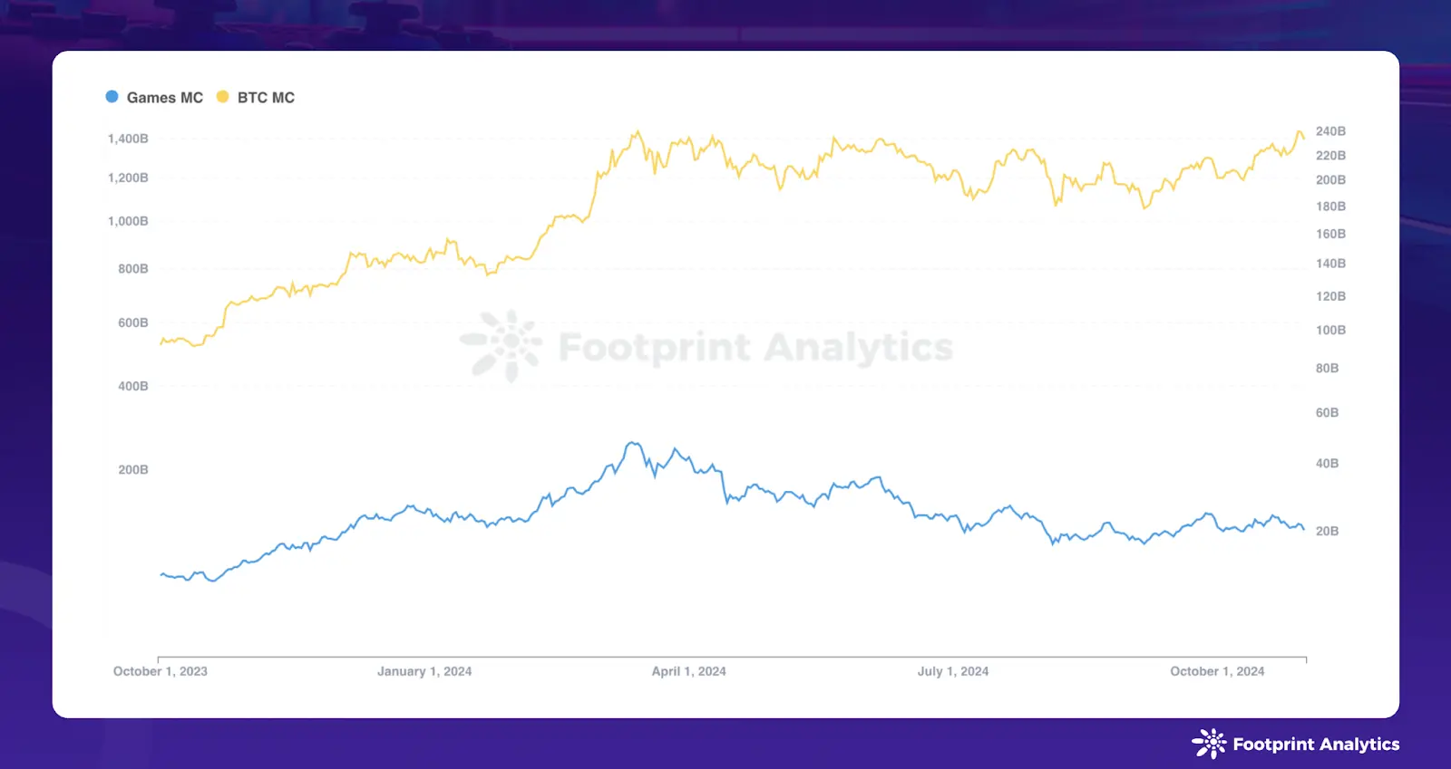 2024 年 10 月,Web3 游戏市场表现平稳,与更广泛的加密市场增长态势形成对比。比特币在月内上涨了 15.9%,接近其历史价格最高点,游戏代币市值则保持在 211.5 亿美元水平,与上月接近。日活跃用户达到了 530 万,主要由基于 Telegram 的游戏推动,尤其是 Matchain、Sui 和 Core 等区块链通过引入 Telegram 游戏取得了显著的用户增长。