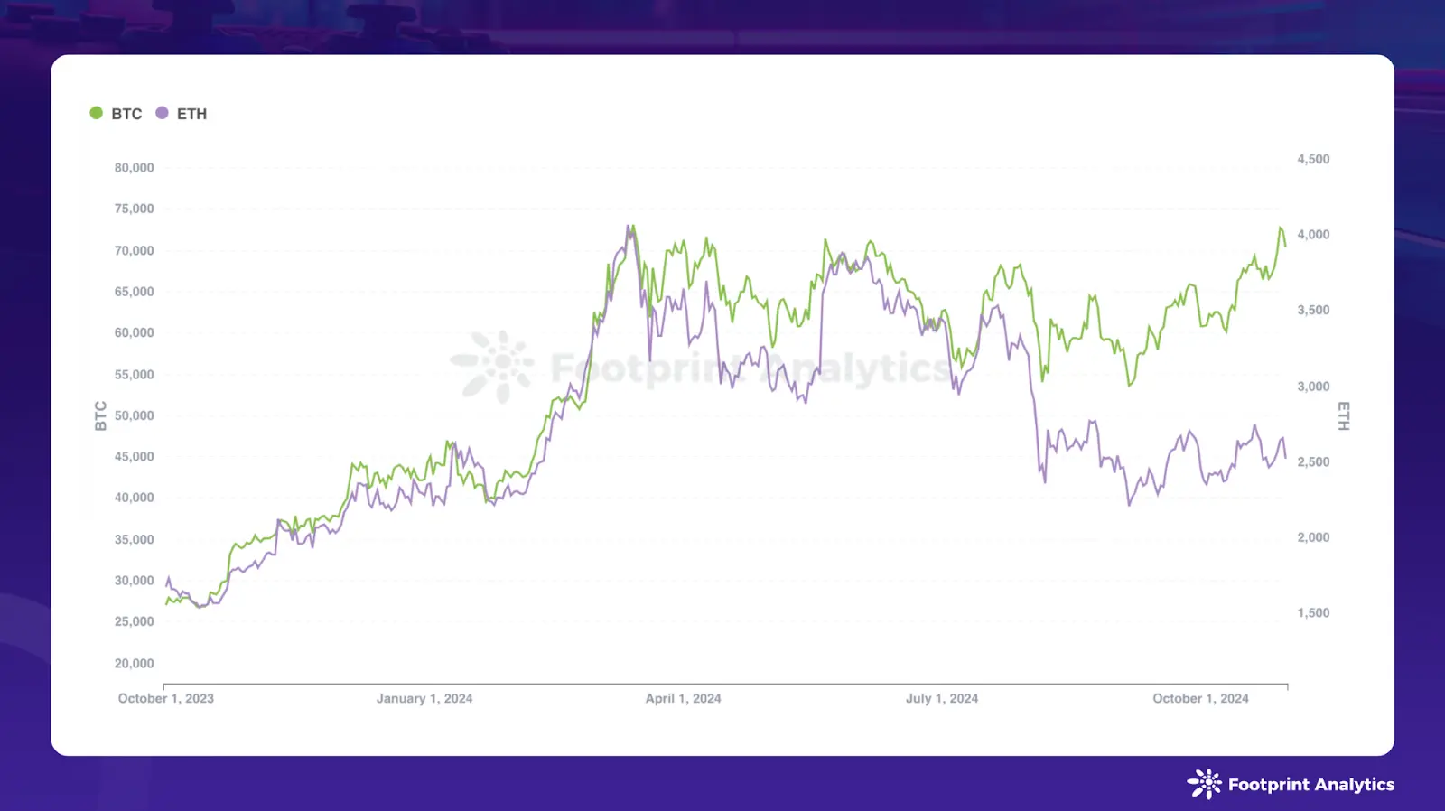 10 月,加密市场表现不一,比特币表现出显著的强势,而其他领域的涨幅则较为温和。比特币从 60,764 美元上涨至 70,398 美元,涨幅达 15.9%。值得注意的是,比特币在 10 月 29 日触及 72,751 美元,接近 2024 年 3 月 14 日创下的 73,104 美元的历史高点。相比之下,以太坊的表现较为平淡,从 2,453 美元上涨至 2,519 美元,仅增长 2.7%。