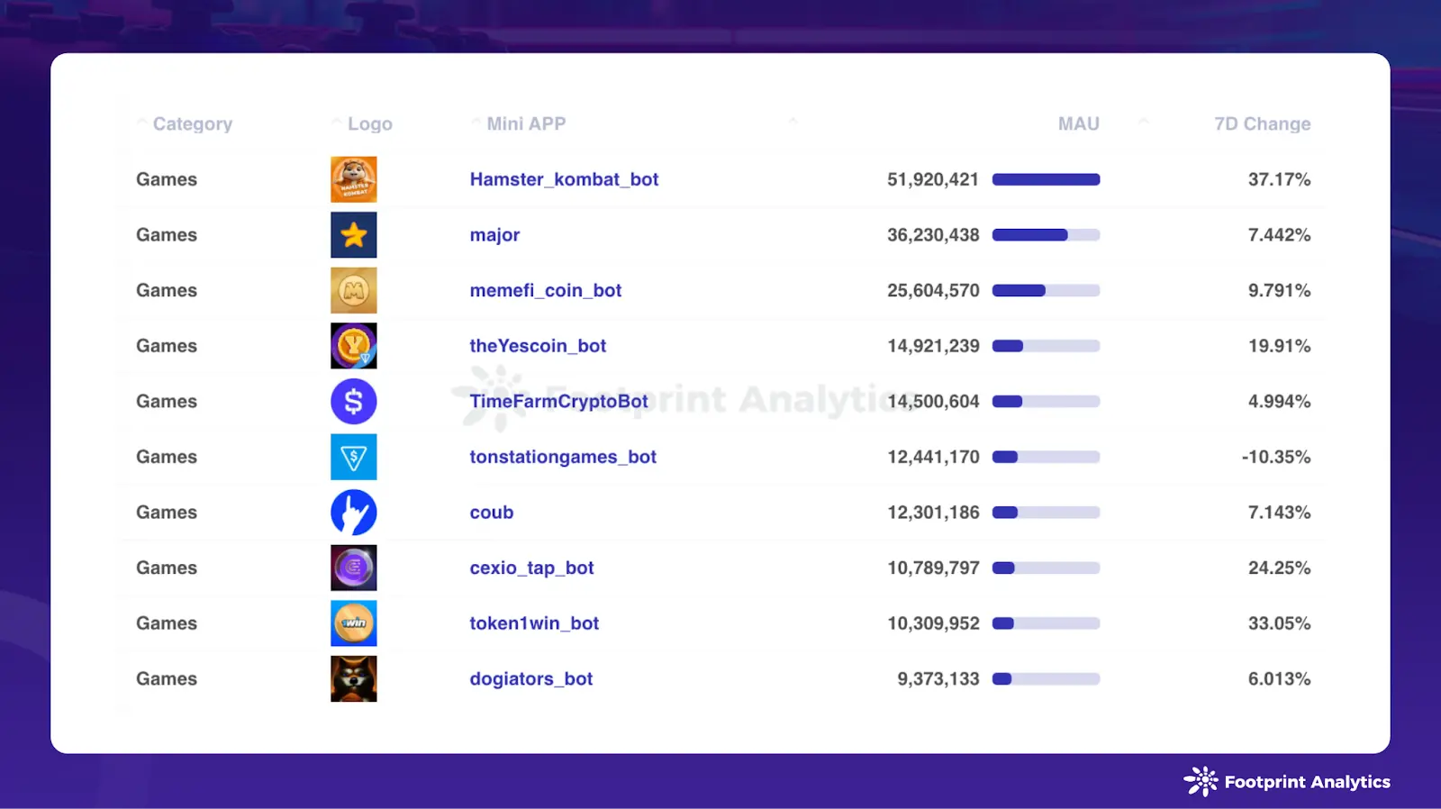Sui 表现强劲,日均 DAU 增长 105.1% 至 18.6 万。多个基于 Telegram 的项目推动了这一增长:BIRDS(一个 Memecoin 和 游戏小程序)和 MemeFi。其中 MemeFi 在空投活动前几周将其代币发行从以太坊 L2 Linea 转至 Sui。这种 Memecoin 与游戏的策略结合似乎是 Sui 保持用户活跃度的方式。