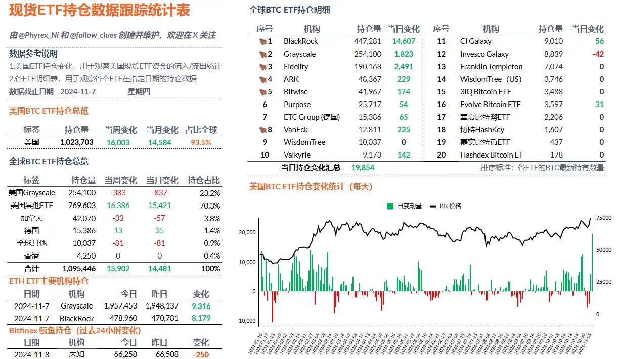 不仅伴随着单日资金净流入创下新高,也创下了持仓量的新高。逻辑也很清楚明了,在 Trump 上台之后,很有可能会出现「加密金元」,美国政治力量支持加密的力量会越来越强。对于传统金融的「大户」来说,他们对于加密进行资金配置的可能提高,BTC ETF 成为了最方便的投资加密的渠道,对于其他美股投资者来说,BTC ETF 也会在 Trump 的站台下变得非常具有吸引力。
