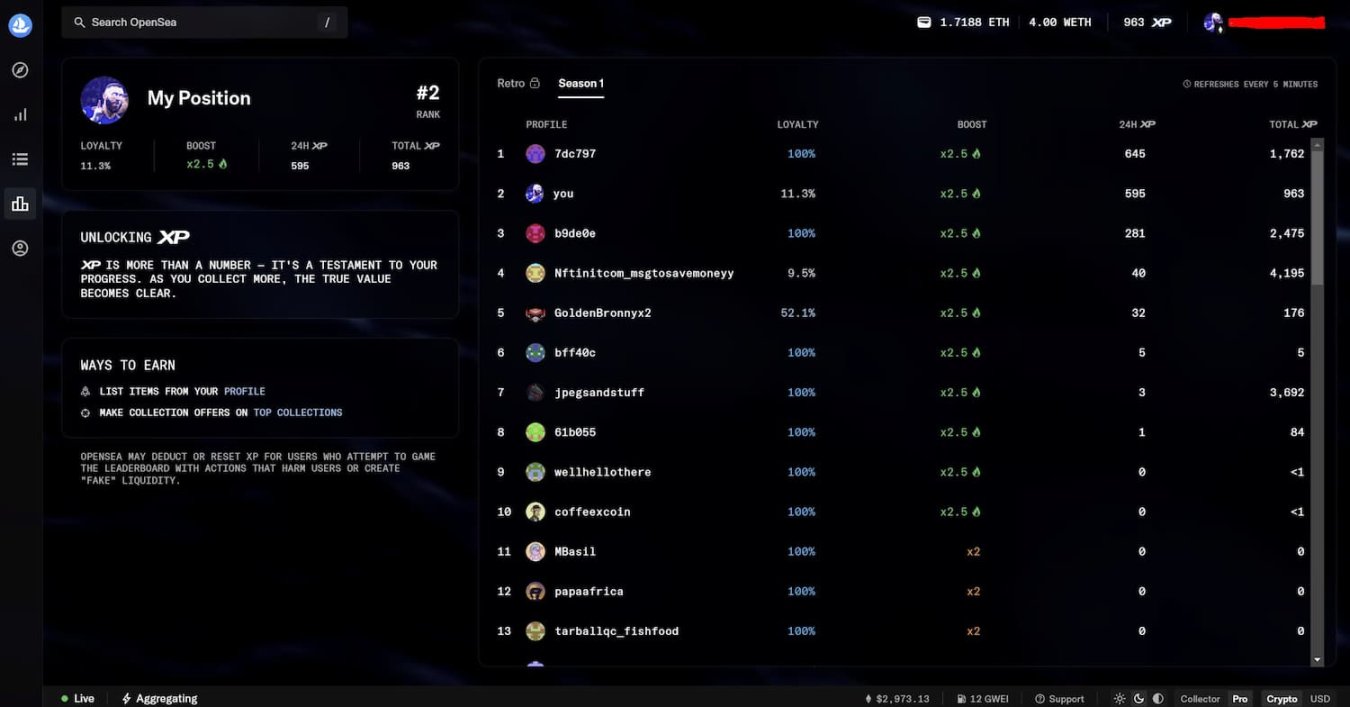 3、从 Leaderboard 页面可以看出,OpenSea 将为用户分发 XP 追溯奖励,还将举办第一季 XP 活动, 赚取的方式包括上架 NFT、为顶级 NFT 系列出价(offer)。总 XP 奖励还与忠诚度、BOOST 有关,其中,仅在 OpenSea 上架 NFT 可以最大化用户的忠诚度,而 BOOST 乘数则与排名有关。
