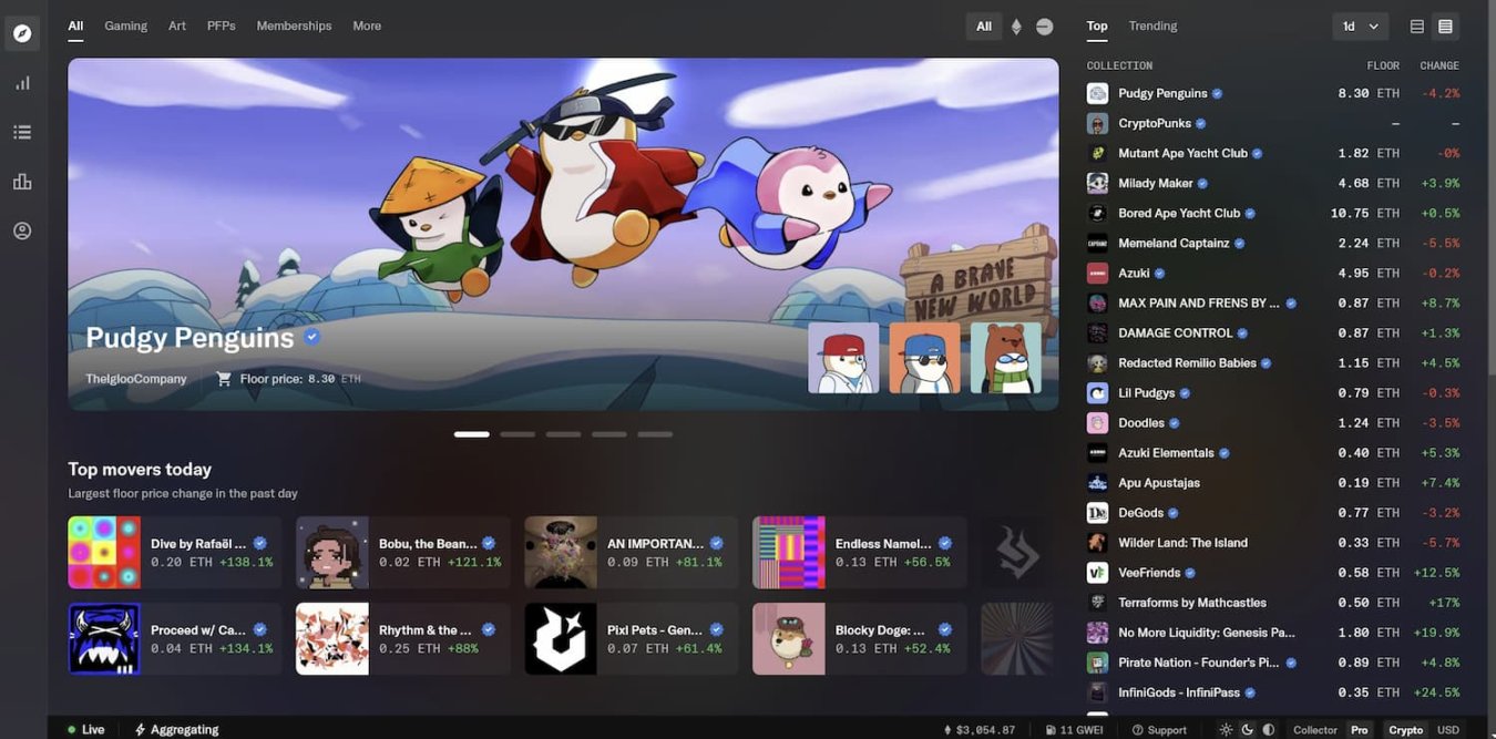 1、全新的用户界面: 其中包含了按前一日成交量、地板价涨幅排名的 NFT 系列列表,以及热门趋势系列,让用户一目了然。