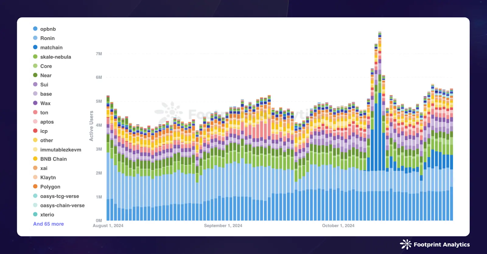 2024 年 10 月区块链游戏领域有 1,606 款活跃游戏, BNB 链 , Polygon , 和 以太坊 主导游戏分布。OpBNB 以 120 万平均日活跃用户(DAU)领跑用户参与度,其次是 Ronin(88.6 万 DAU)和 Matchain(54.8 万 DAU)。