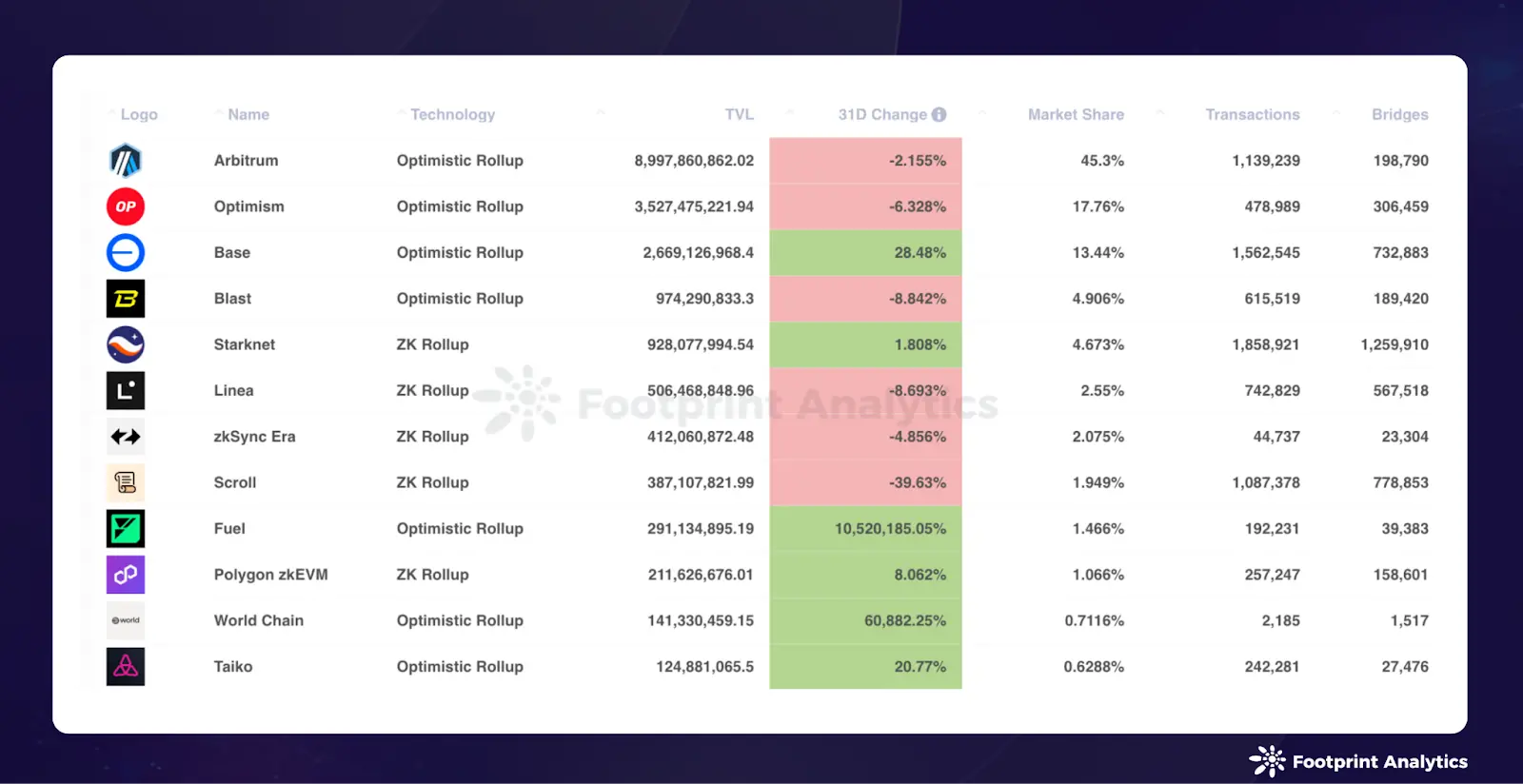几个新进入者产生了显著影响。Fuel Ignition 和 World Chain 在主网启动后 TVL 大幅增长,而 Taiko 的 TVL 在 Panko Finance 和 Avalon Finance 的成功推动下增长了 20.8%。