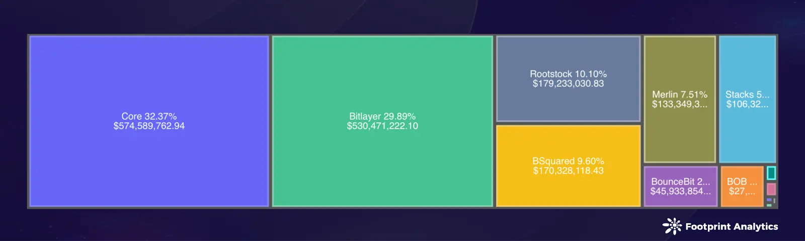 Core 保持行业领先地位,TVL 增长 29.8% 至 5.7 亿美元,市场份额为 32.4%。Bitlayer 巩固其地位,TVL 增长 36.1% 至 5.3 亿美元,占据 29.9% 的市场份额。Rootstock 以 1.8 亿美元的 TVL 和 10.1% 的市场份额位居第三,而 BSquared 异军突起,TVL 达到 1.7 亿美元,月增长 54.4%,超越 Merlin 跃升至第四位。