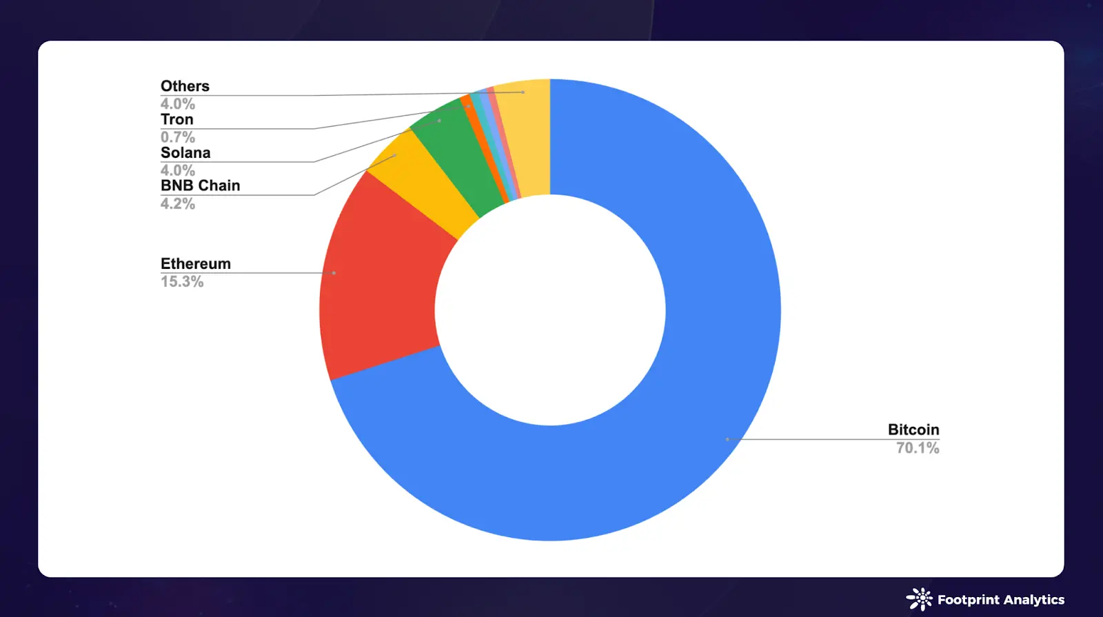 2024 年 10 月,区块链加密货币的总市值增长 6.7% 至 2.0 万亿美元,比特币的市场主导地位从 9 月的 67.3% 增强至 70.1%。与此同时,以太坊的份额继续下降,从 16.8% 降至 15.3%,而 BNB 链和 Solana 的份额相对稳定,分别维持在 4.2% 和 4.0%。
