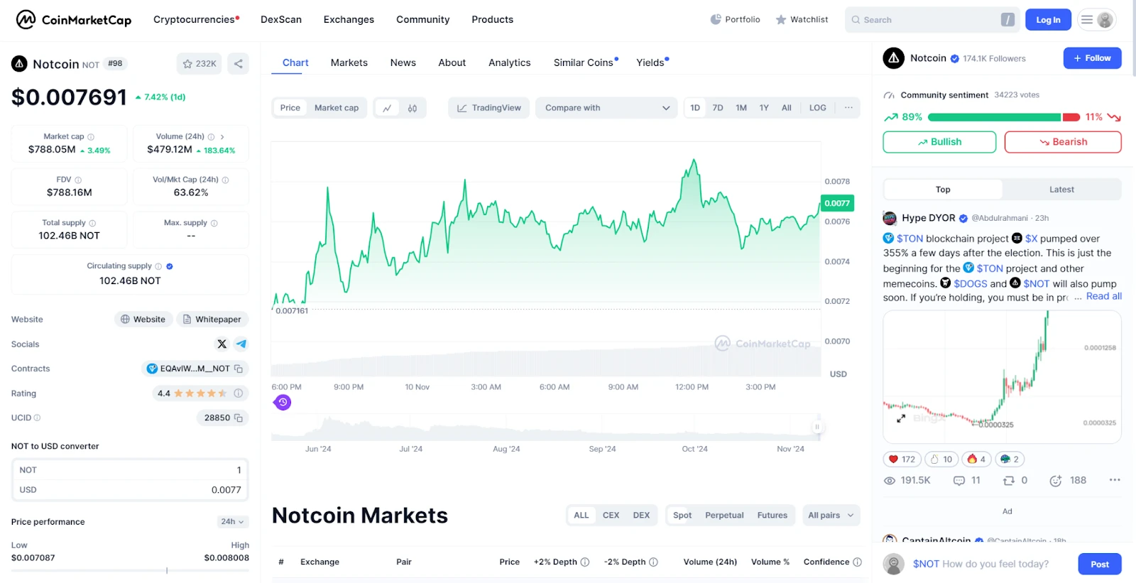 Notcoin(NOT)是 TON 生态上的一款病毒式 Telegram 游戏,通过点击赚取挖矿机制吸引了众多用户加入web3,Telegram 坐拥全球近 10 亿用户。NOT 利用 Telegram 的用户优势, 选择了粘性非常高的游戏赛道,直接成功登上了 Binance 等多个主流交易所。