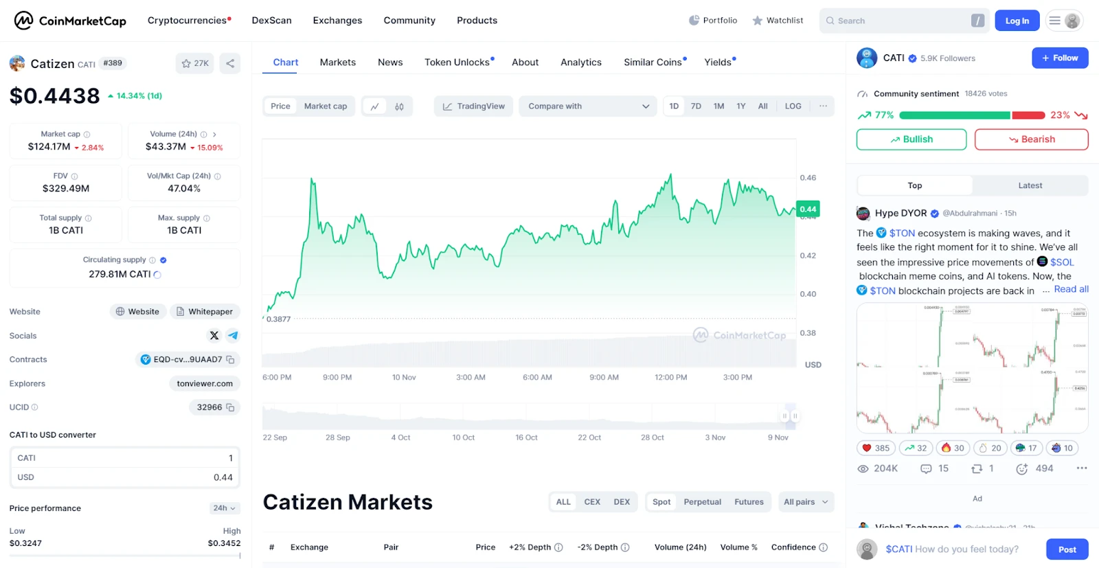 同样引人注目的还有 CATIZEN,这个以游戏概念为核心的项目,FDV 为 3.29 亿美金。作为游戏领域的佼佼者,CATIZEN 凭借其独特的游戏玩法和丰富的用户体验,吸引了大量忠实用户。未来,随着游戏市场的持续扩张和用户对高品质游戏内容的追求,CATIZEN 有望实现 5 倍的增长空间,达到 20 亿美金的预期估值。