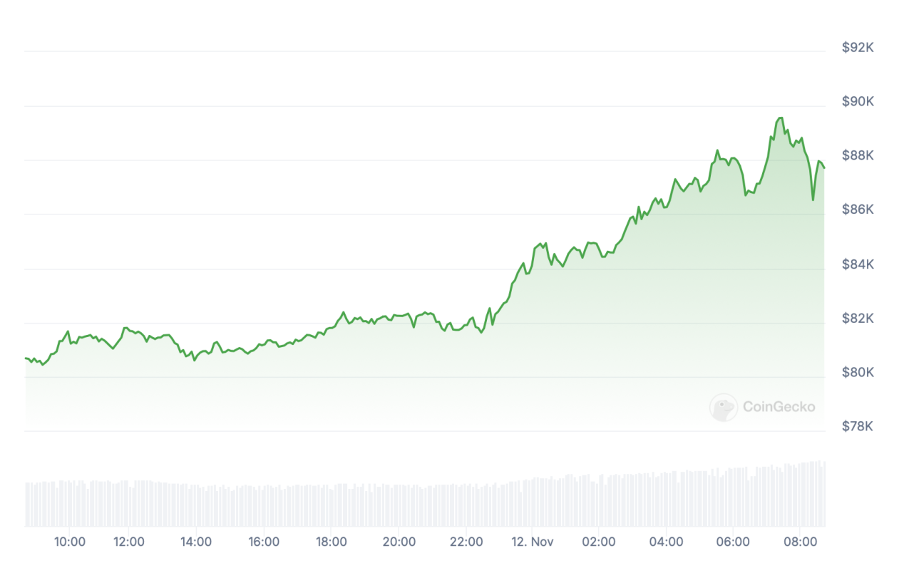 11月11日晚间,在美股上市公司MicroStrategy(微策略)再次公告买入比特币后,比特币开始了快速拉升,从8.2万美元连续拉升,在今晨7点创下8.9万美元的新高。